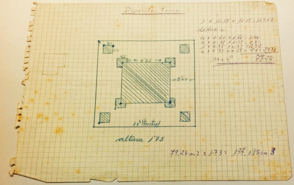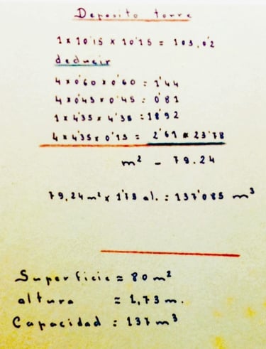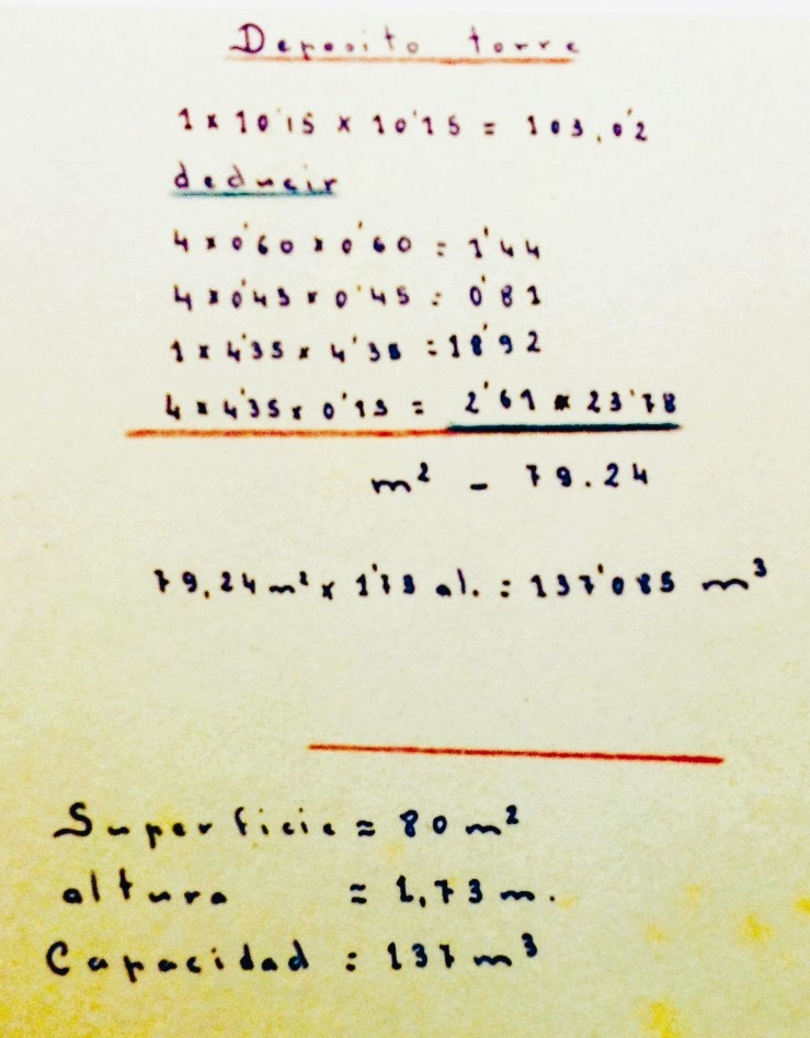 ESTOS DOS DOCUMENTOS del año 1952 presentan el calculo en m3 de los depósitos de agua de la torre y fueron ENCONTRADOS EN EL ARCHIVO HISTORICO DE ASTURIAS EN EL EXPEDIENTE DE LA INSTALACION DE AGUA, para el envío a LOS ALJIBES de la torre desde los depósitos ENTERRADOS .