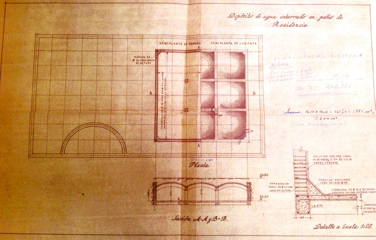 Localizados en el Archivo Histórico de Asturias , así como en el la biblioteca de la escuela superior de Arquitectura de Madrid los planos y detalle correspondientes tanto a los depósitos situados en el patio de la antigua residencia , así como los que se sitúan en la torre , podemos decir que la capacidad de almacenamientos de los enterrados era de 402.381 litros de agua y los de la torre con una capacidad de 137.085 litros , sumando entre los dos un total de 539.476 litros al completo .
