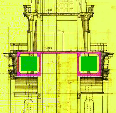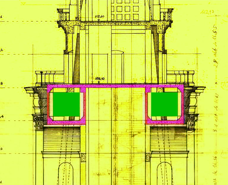 En este esquema de la sección de la torre , hemos señalado en color verde ,la ubicación de los depósitos de agua , entre las cotas de altura 105,4 a 107,8 metros , inmediatamente debajo del mirador en la planta 17 , estando los depósitos en los cuatro lados de la torre, teniendo registros de nivel de dichos depósitos en esta planta 17 , en los lados este y sur de la misma.
