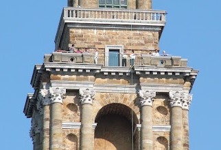 sección de la torre con los depósitos en color verde y vista del exterior con el mirador en cuyo suelo se encuentran los registros de nivel