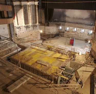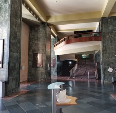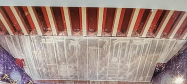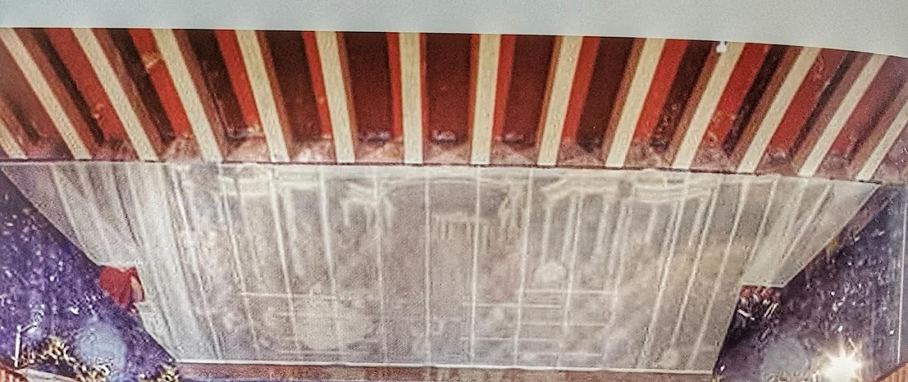 foto anterior a la modificación del teatro , donde se ve el mural con una protección para evitar caídas de partes del techo donde estaba el mural , que en los últimos nueve años estuvo cerrado , y eso represento un gran deterioro del mismo . antes del comienzo de las obras , existían grietas , zonas desprendidas muy importantes , con múltiples elementos clavados con el fin de evitar mayores caídas de zonas.