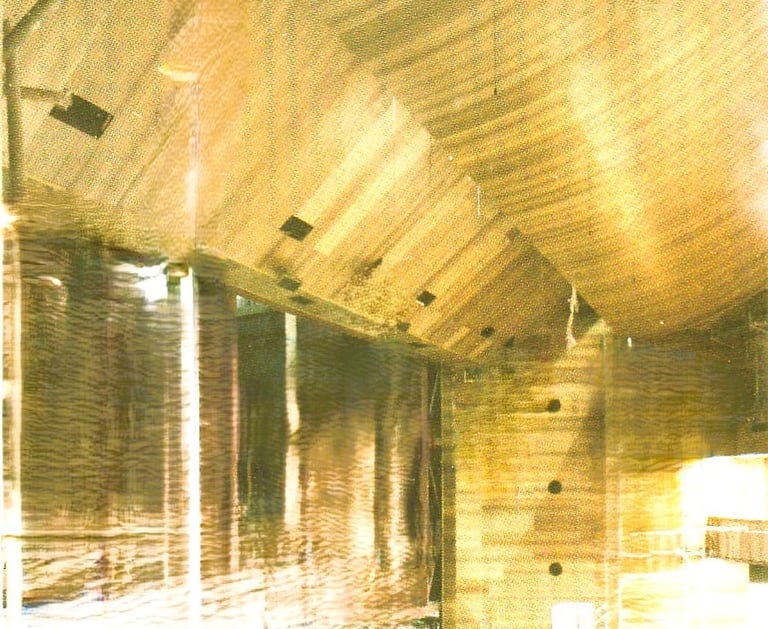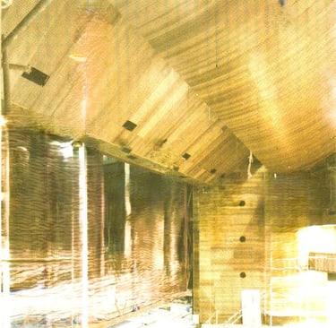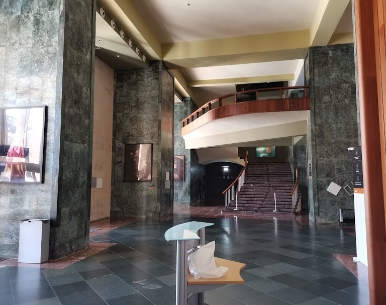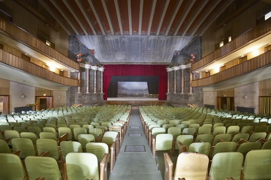fotos del estado final del teatro , una vez acabada la reforma y donde se puede observar la parte del techo en madera que cubre el antiguo mural .
