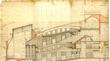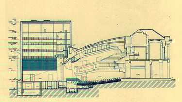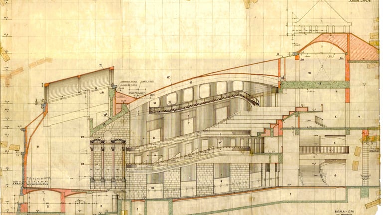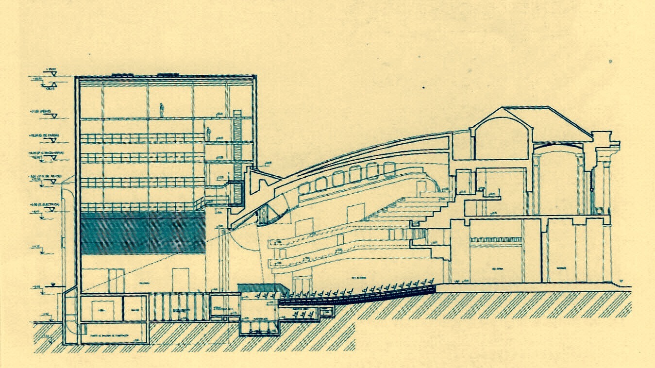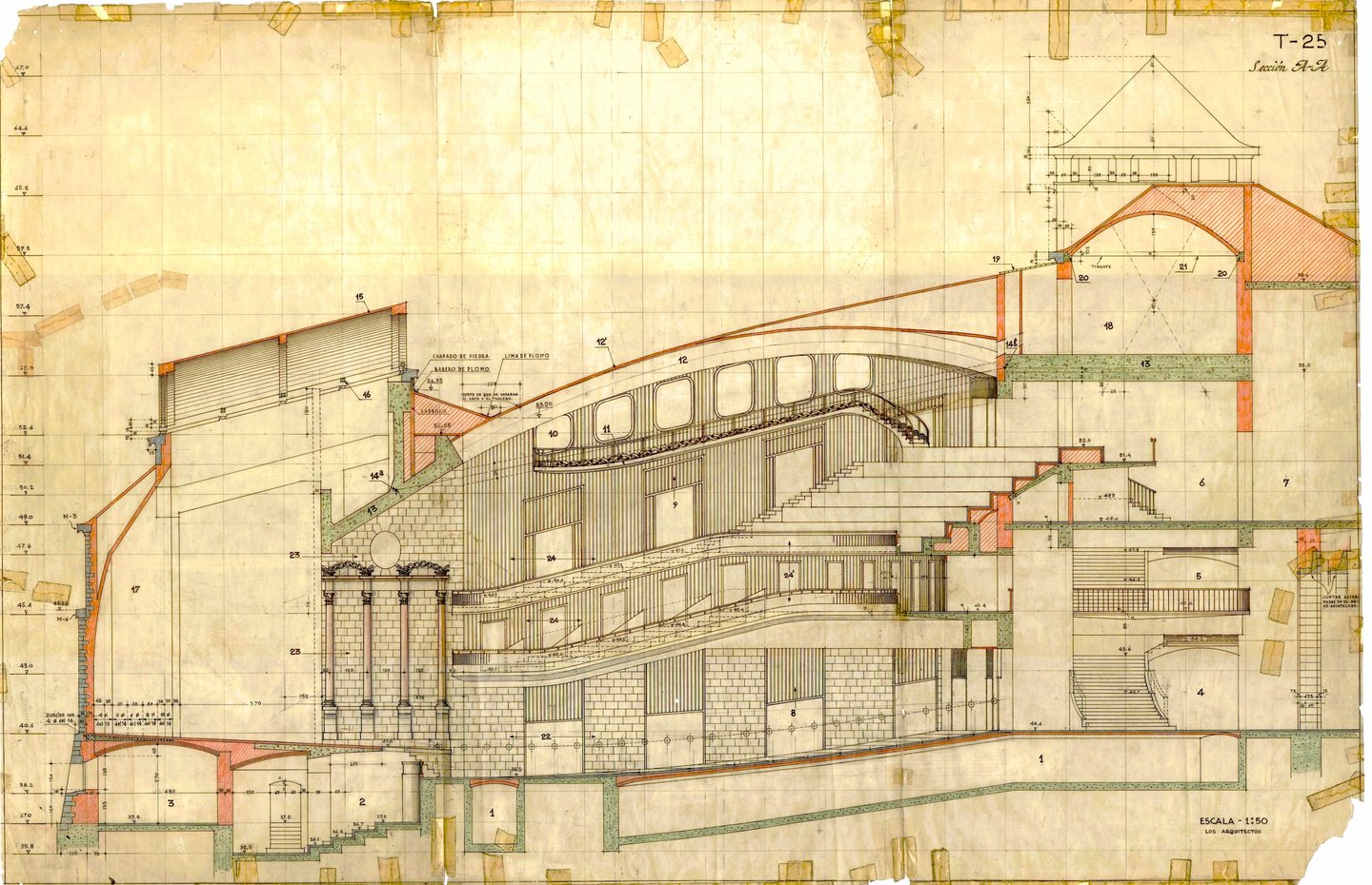 antiguo plano de la seccion del teatro donde se ve la caja escénica original de los años 50 del siglo pasado