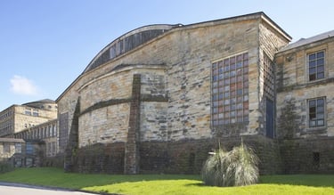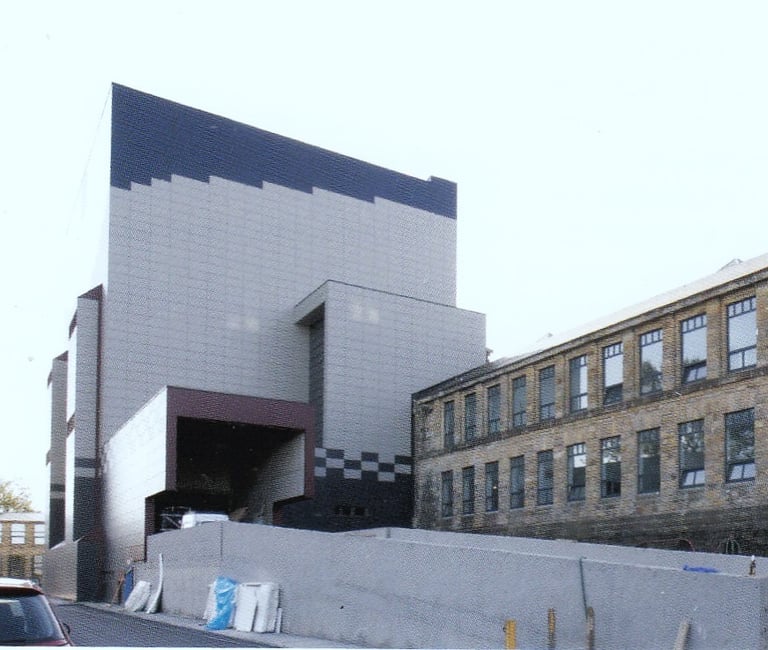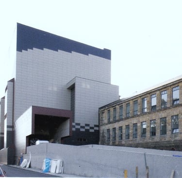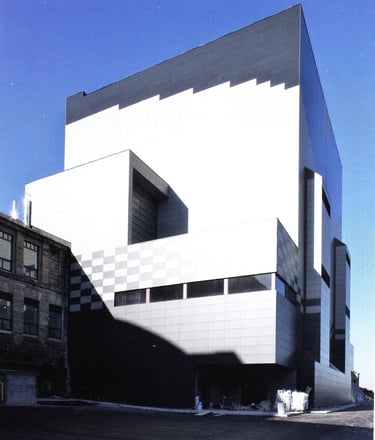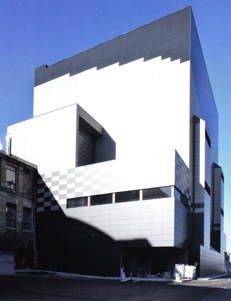 polémico exterior de la CAJA ESCENICA que rompe el acabado en piedra del edificio