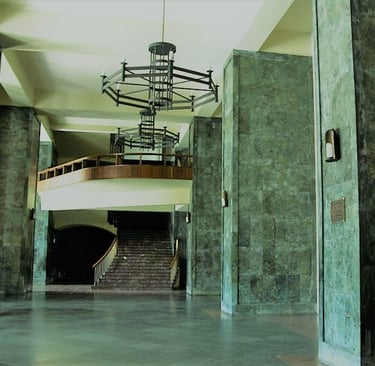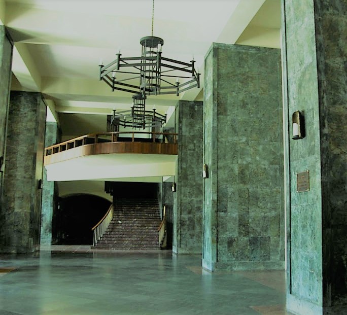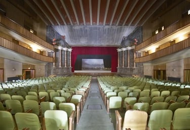 en el interior se aloja un salón de actos . después viene su uso como teatro o cine. y un primer piso con una gran sala de recepciones .