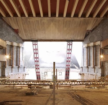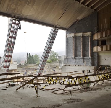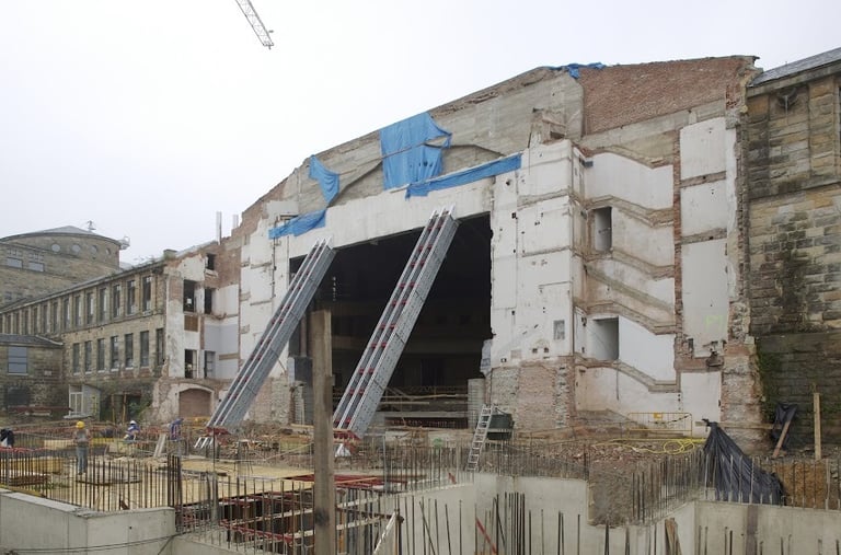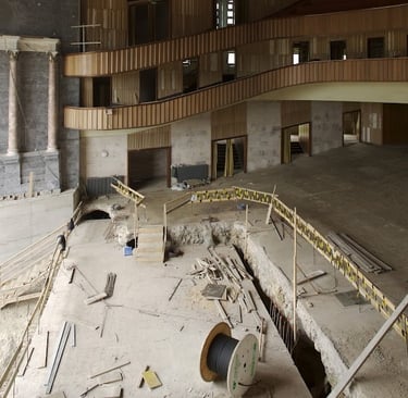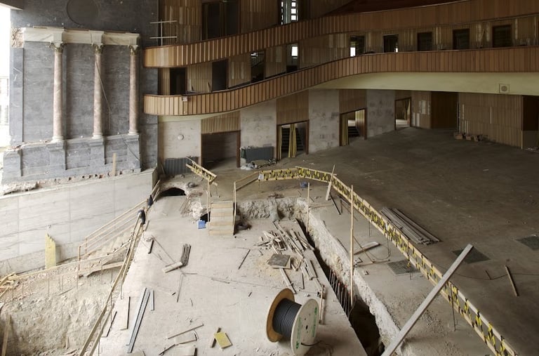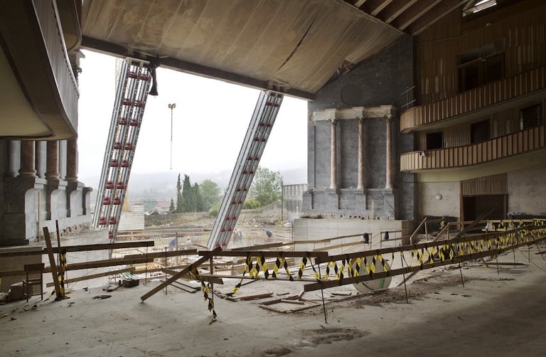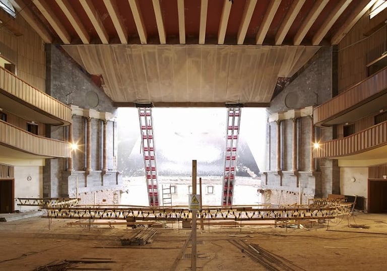 cuatro momentos de las obras realizadas en el interior para la transformación del aula magna en teatro contemporáneo