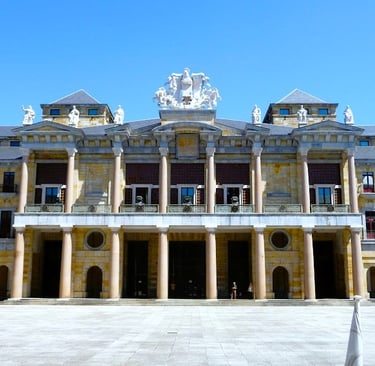 Finalmente se remata la fachada con el escudo de España (de 7,80 metros ) realizado por el escultor Manuel Laviada así como las seis estatuas en posición sentada de Francisco de Quevedo, Miguel de Cervantes ,Lope de Vega , Calderón de la Barca , Moratín y Tirso de Molina .