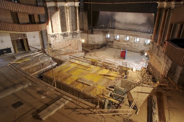 Básicamente , en la reforma se desmontaron los grupos de cuatro columnas en los laterales del escenario, con el fin de permitir la visión completa del nuevo escenario .