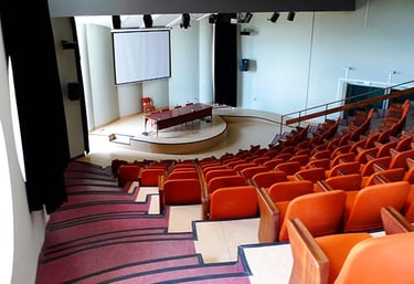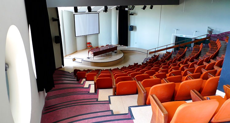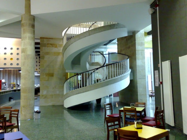 Se sube al paraninfo a través de una espectacular escalera de caracol que parte del local inferior ( cafetería) . La cubierta es curva y en la misma se utilizo planchas de metal.