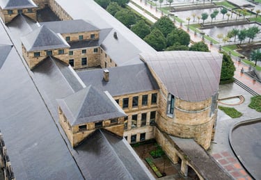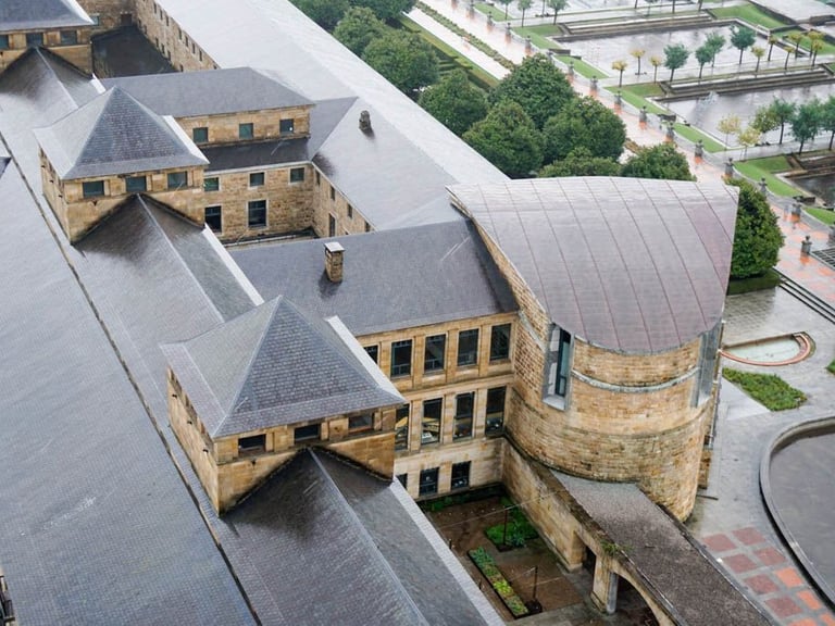 EL PARANINFO es la pieza de arquitectura que sorprende por su vanguardismo , SE ENCUENTRA ADOSADO A LA FACHADA SUR , LA PLANTA SE ASEMEJA A LA PROA DE UN BARCO Y REMATA EN UN SEMICIRCULO .