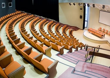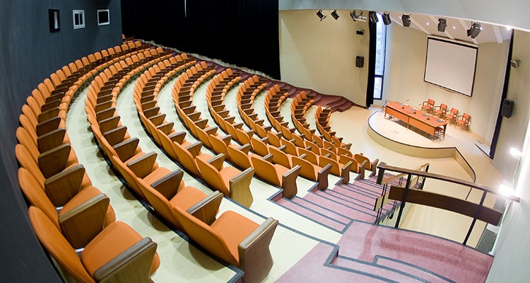 El espacio interior se divide en dos niveles. El superior es el paraninfo propiamente dicho, con una disposición en gradas en abanico .