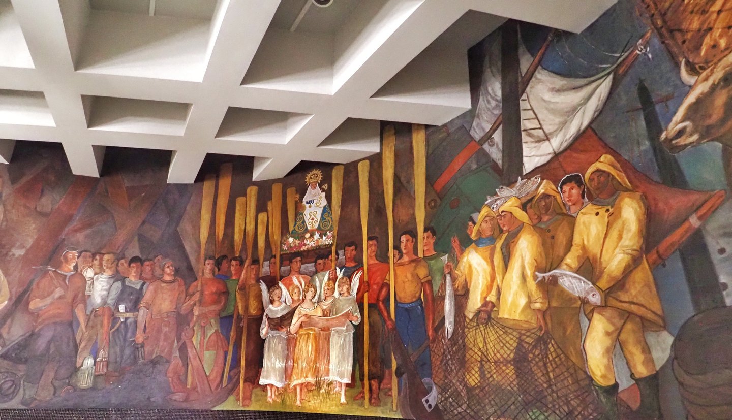 representación de la pesca asturiana y exaltación a la virgen de Covadonga que recibe canticos de alabanza de un coro angélico