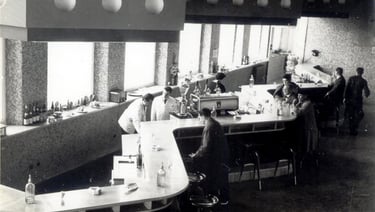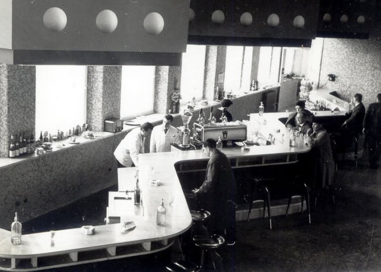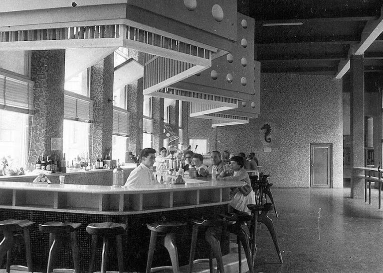 antiguas fotos de la cafeteria donde se observa el desarrollo de la barra dibujo del caballito de mar que era el símbolo de este espacio