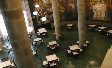 zona de descanso de la cafetería con el gran mural de francisco arias al fondo