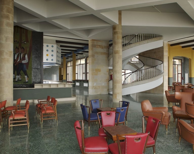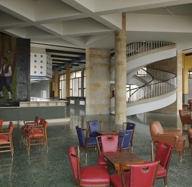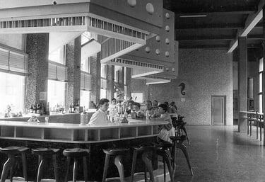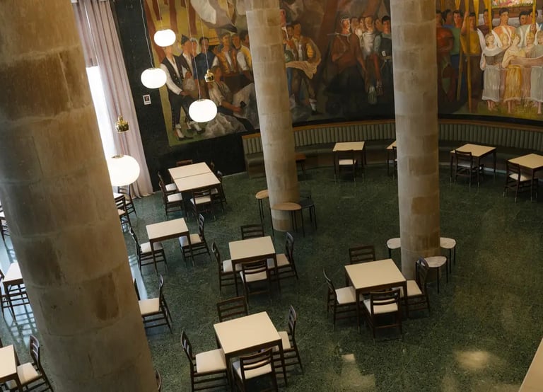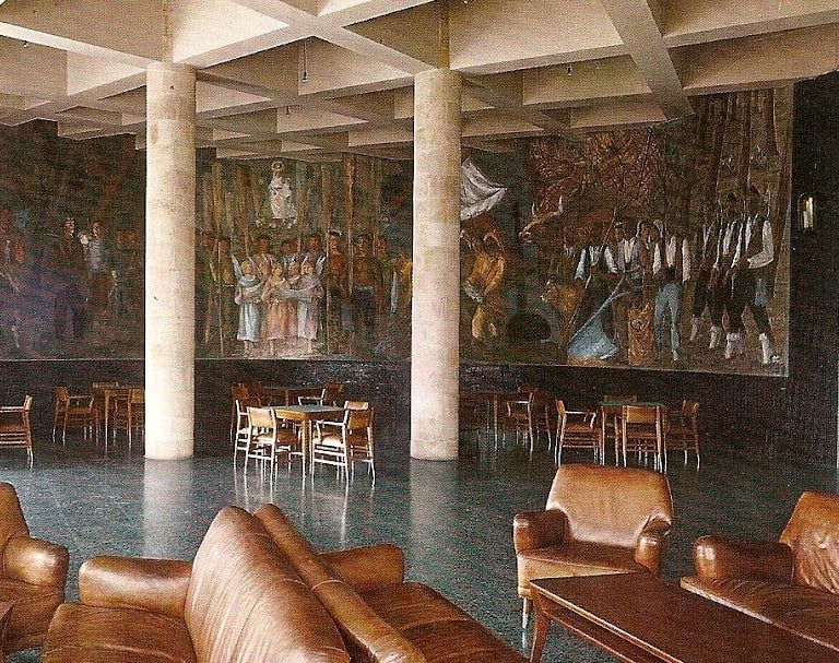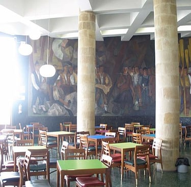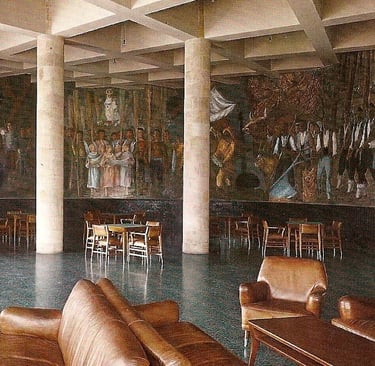 rincón de la cafetería de forma cóncava , con el decorado del mural de francisco arias y donde además se ve el entramado de vigas del techo como otro elemento decorativo
