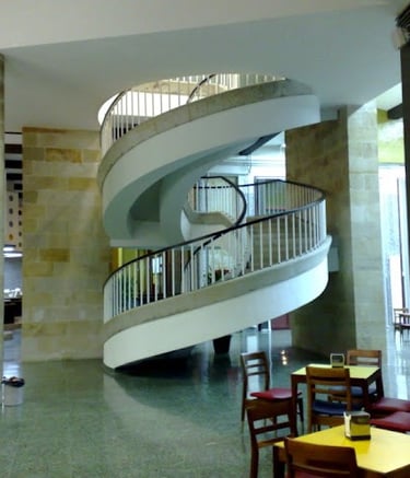 Interior de la cafetería con la espectacular escalera de da acceso al paraninfo