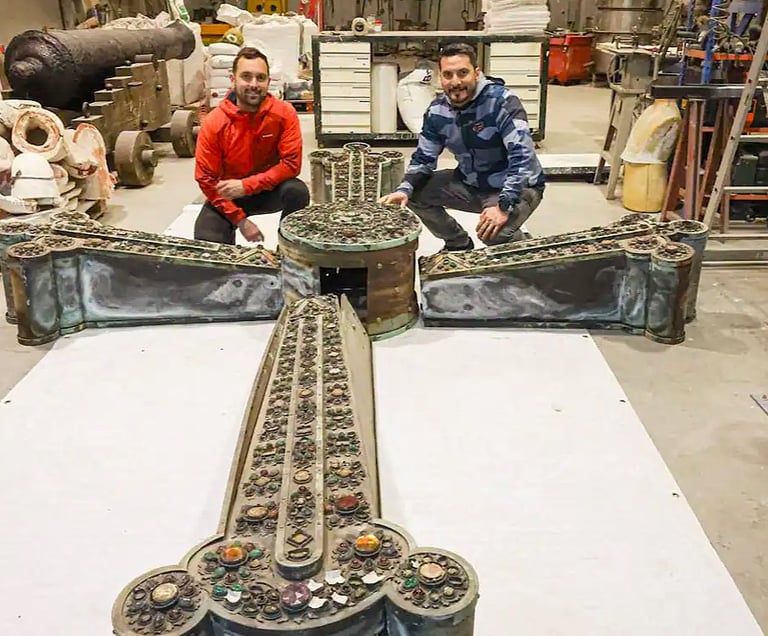 Diversos momentos de la restauración de la cruz por parte de la firma Auriga taller de escultura