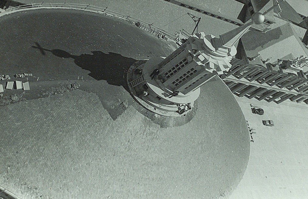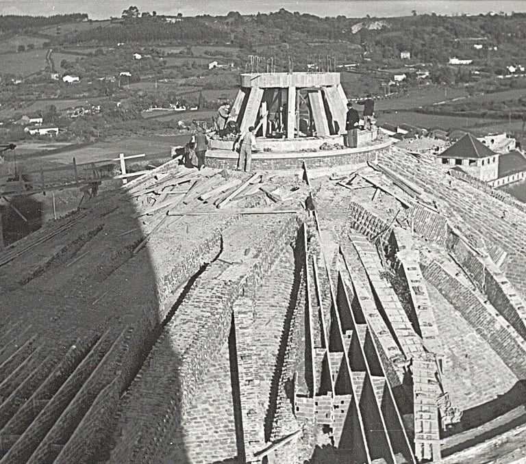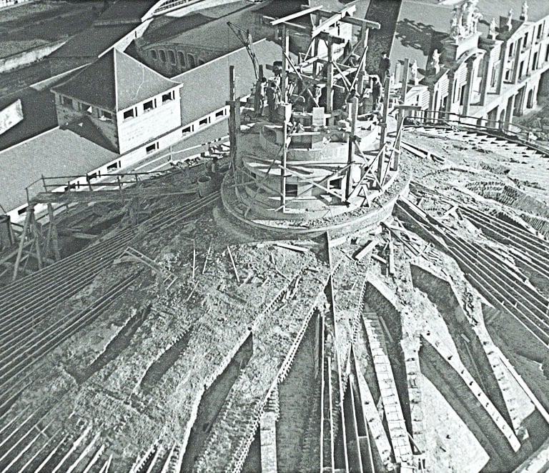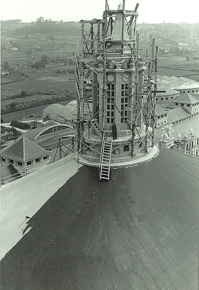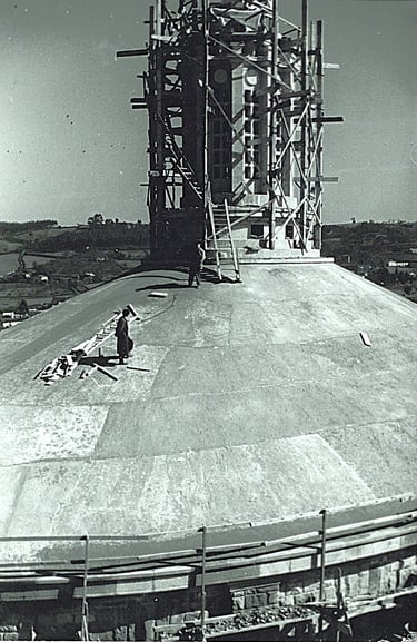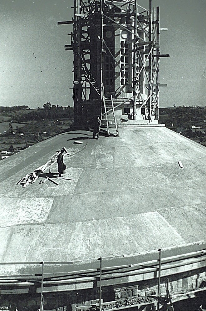foto de la construcción del linternón , donde se ve el remate de la bola y la cruz que se apoyan en una pirámide. de hormigón revestida de piedra.