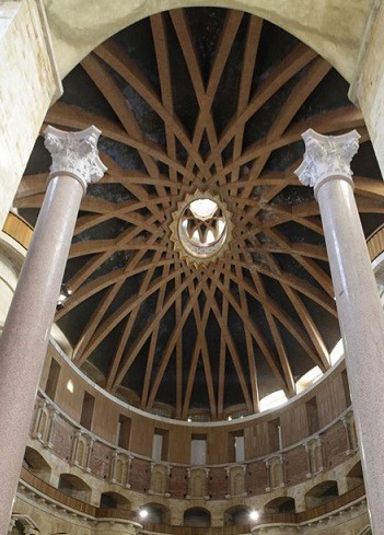 la cúpula es sin duda una de las obras mas atrevidas del conjunto DE LA UNIVERSIDAD LABORAL , montada sobre un conjunto de veinte arcos cruzados , siguiendo la tradición de la laceria hispano mudéjar y complementada con el sistema de bóvedas tabicadas utilizado en el Mediterráneo-oriental