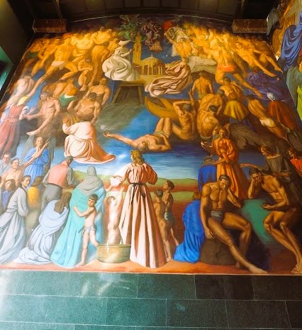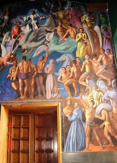 Este mural se inspira en el Juicio Final de Miguel Ángel en la Capilla Sixtina .
