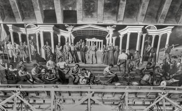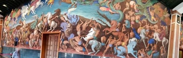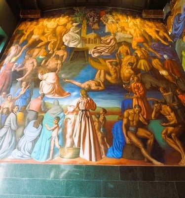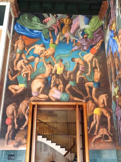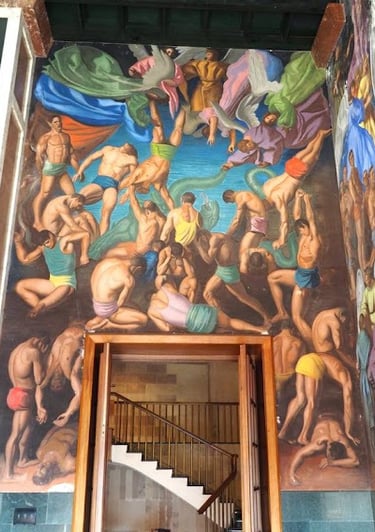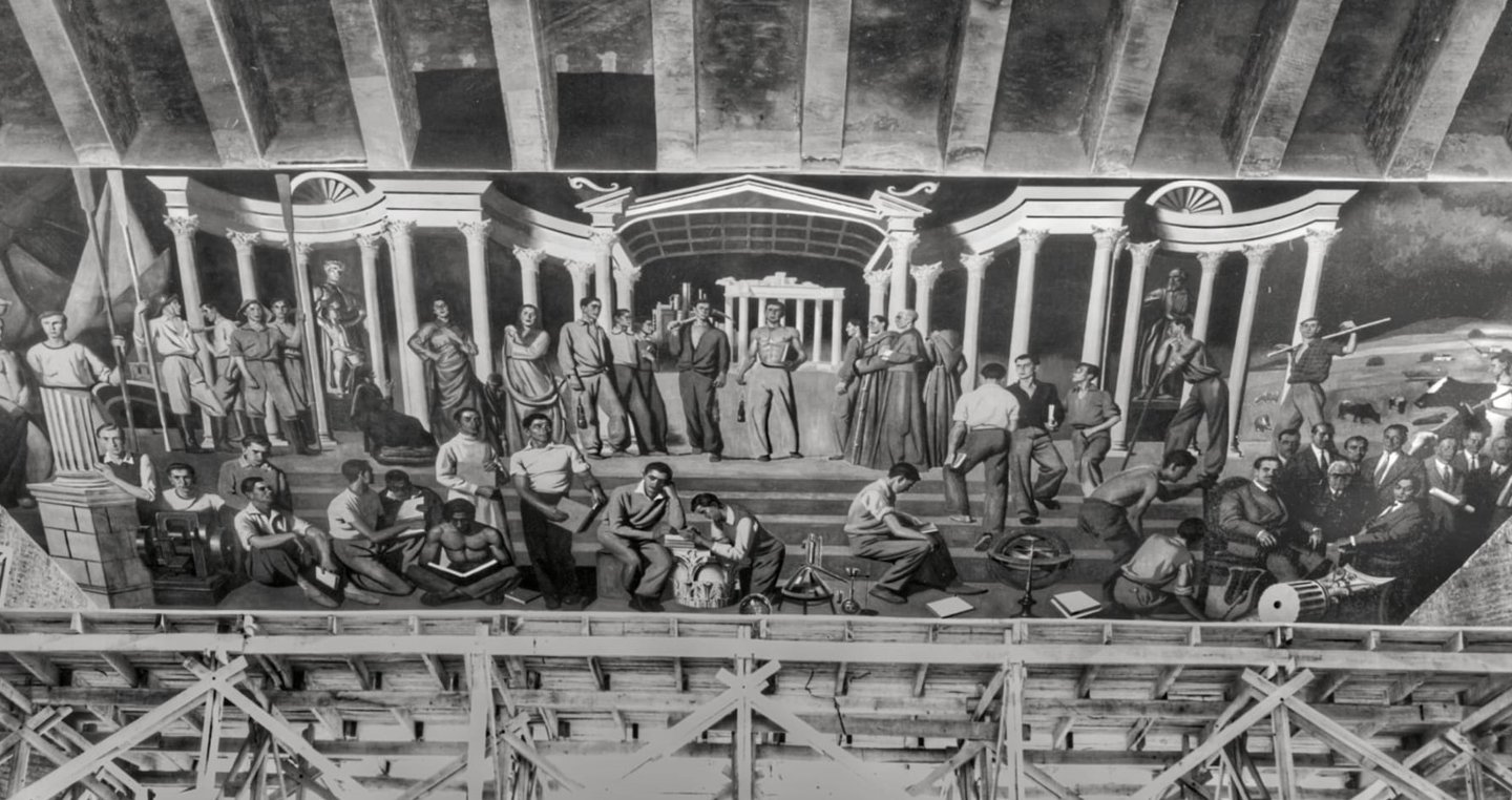 PINTURA MURAL DE ENRIQUE SEGURA SIMBOLIZANDO EL ORIGEN FUNDACIONAL DE LA UNIVERSIDAD LABORAL DE GIJON