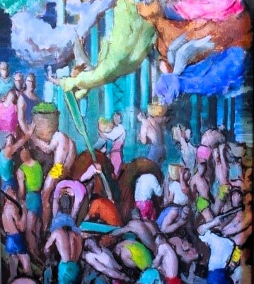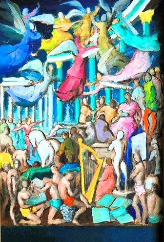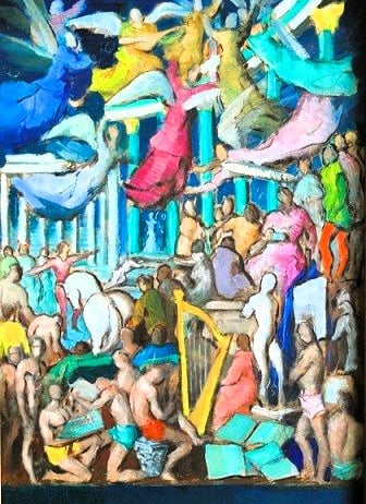 Escena dotada de movimiento y teatralidad , en la que aparecen diversas figuras de ángeles en un entorno de arquitectura clásica e industrial y trabajadores
