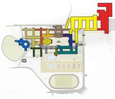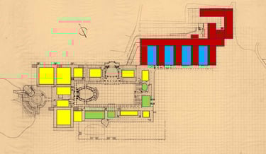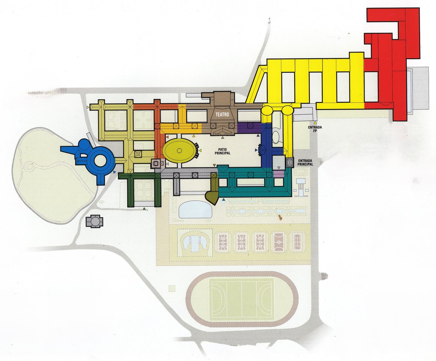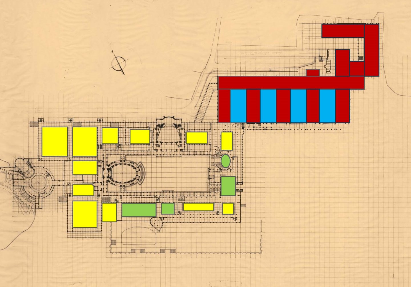 Plano de planta de 1950 del conjunto de edificaciones , donde hemos señalado en amarillo los patios interiores y en verde los singulares ( Barroco, atrio Corintio , Rocalla y patio Dorico) . En azul , los patios interiores entre las naves de talleres